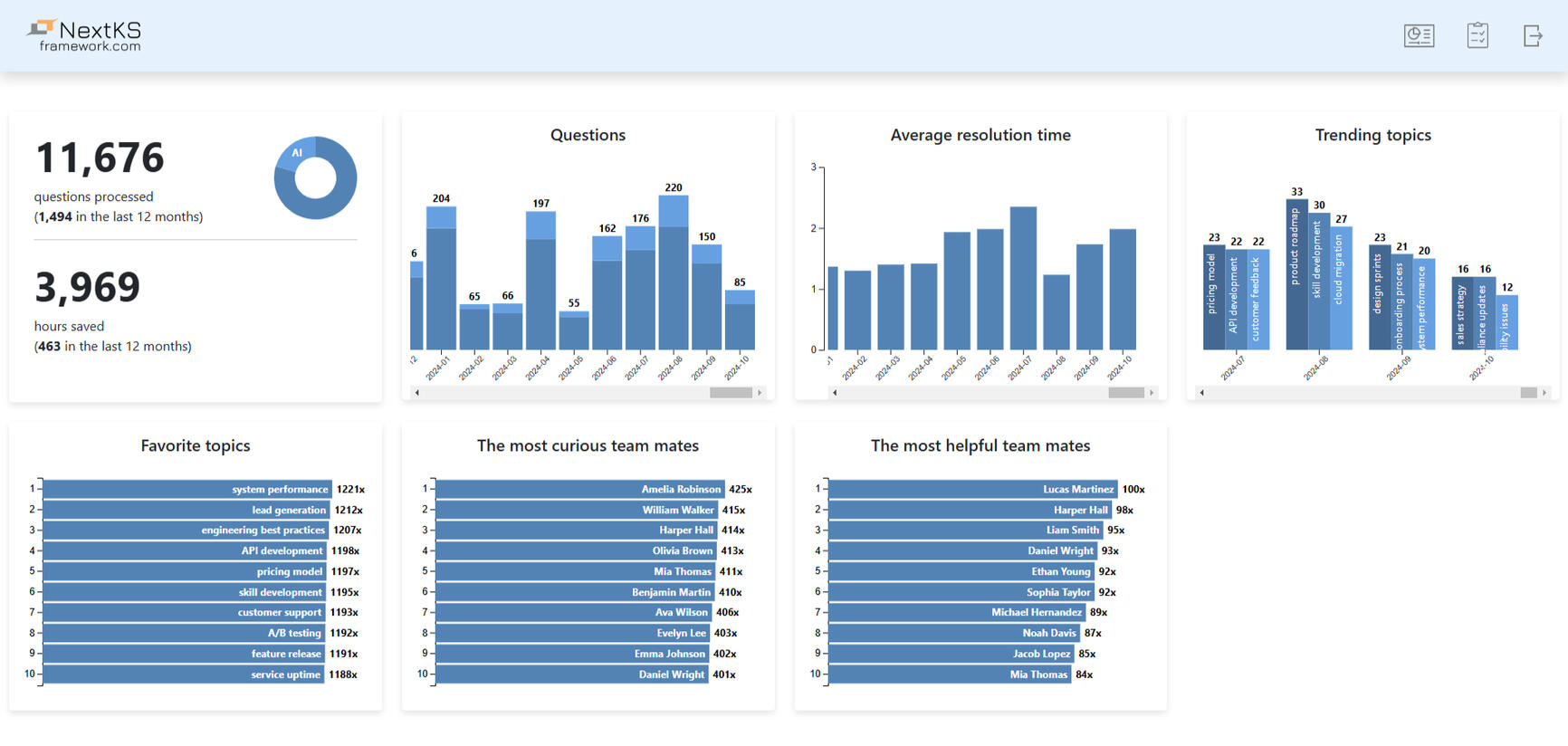 This analytics dashboard provides you with all essential metrics related to the platform's usage. You can track the adoption rate, trending topics, and the approximate number of hours the tool saved in your organization.